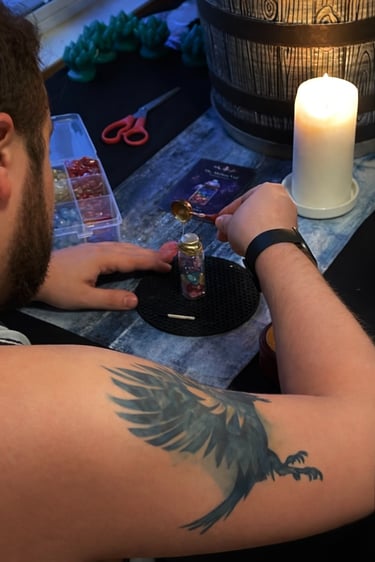 This is the atelier -- the quiet space where crystals are chosen, intentions are set, and each creation begins its journey. Here you'll find glimpses of the real process behind the pieces: a table scattered with precious stones, herbs, tools, and the small moments where inspiration becomes something tangible.
